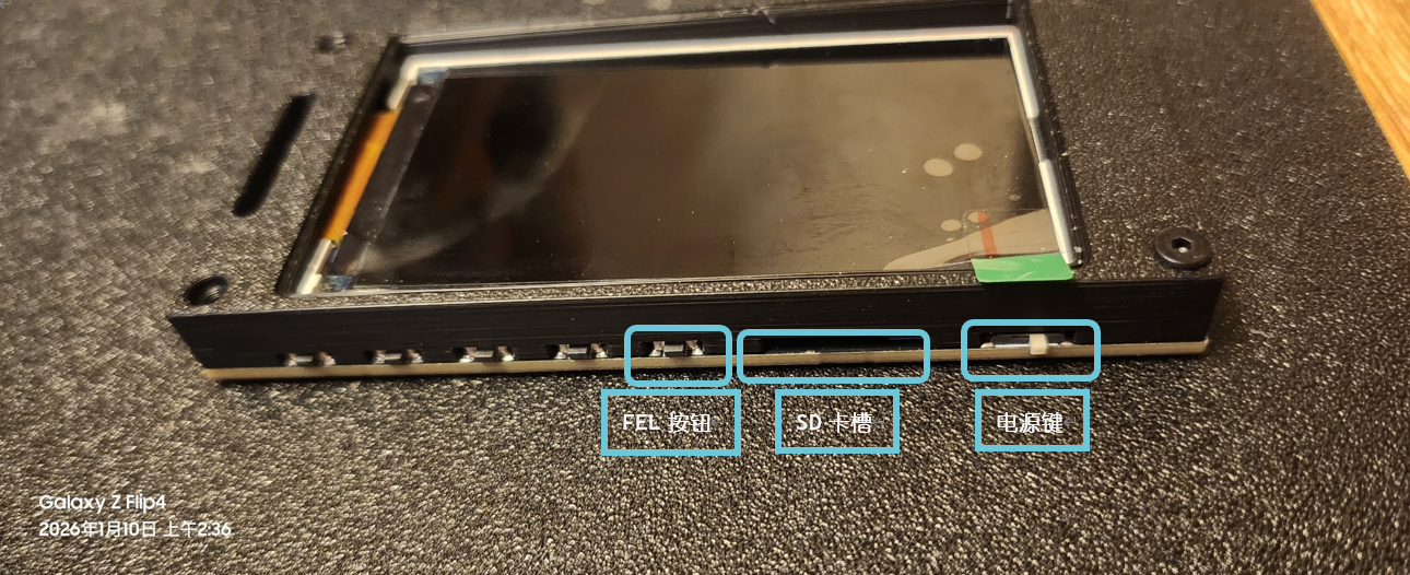 - 按下FEL按键的同时打开电源开关(打开开关时按住FEL按钮),进入FEL模式。
